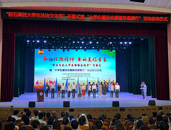 开幕式上,与会领导为大学生普法志愿者佩戴绶带并为大学生普法志愿服务队授旗,驻石家庄29所高等院校共约50万名大学生将参与法治文化节和开展“法律九进”为主要内容的基层普法志愿活动。