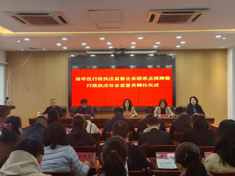 为持续优化法治化营商环境,拓宽社会监督渠道,提升监督能力,推动严格规范公正文明执法,11月7日,石家庄市裕华区司法局举行了行政执法监督企业联系点授牌暨行政执法社会监督员聘任仪式。石家庄市裕华区司法局领导班子成员,裕华区重点行政执法单位、各街道(镇)法治工作主管领导、法治工作负责人,10家企业联系点代表以及15名社会监督员参加活动。